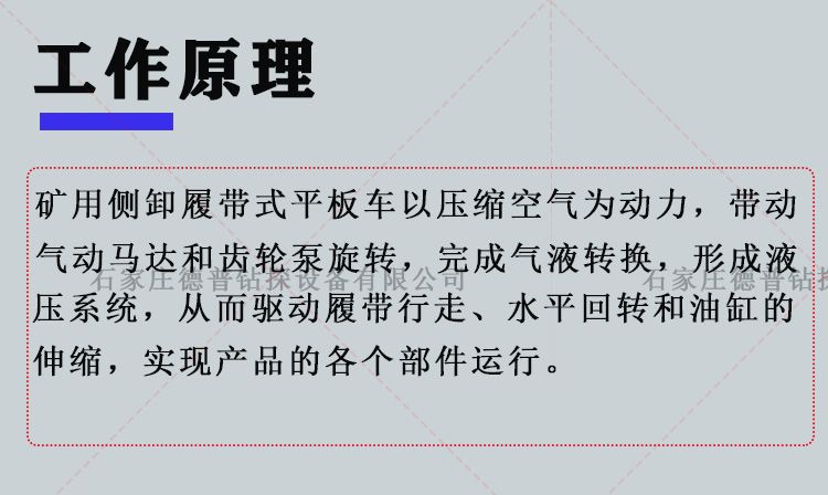 MPCQL-10.5D型侧卸式矿用履带平板车是一种以井下气源为动力,集运输、吊装和自卸为一体的井下运输设备,体积小,方便灵活,安全性高,适用于中小重量的各类部件的运输、吊装和侧卸。矿用履带式平板车具有结构合理, 技术性能先进、工艺适应性强、操作省力、安全可靠、工作效率高等优点